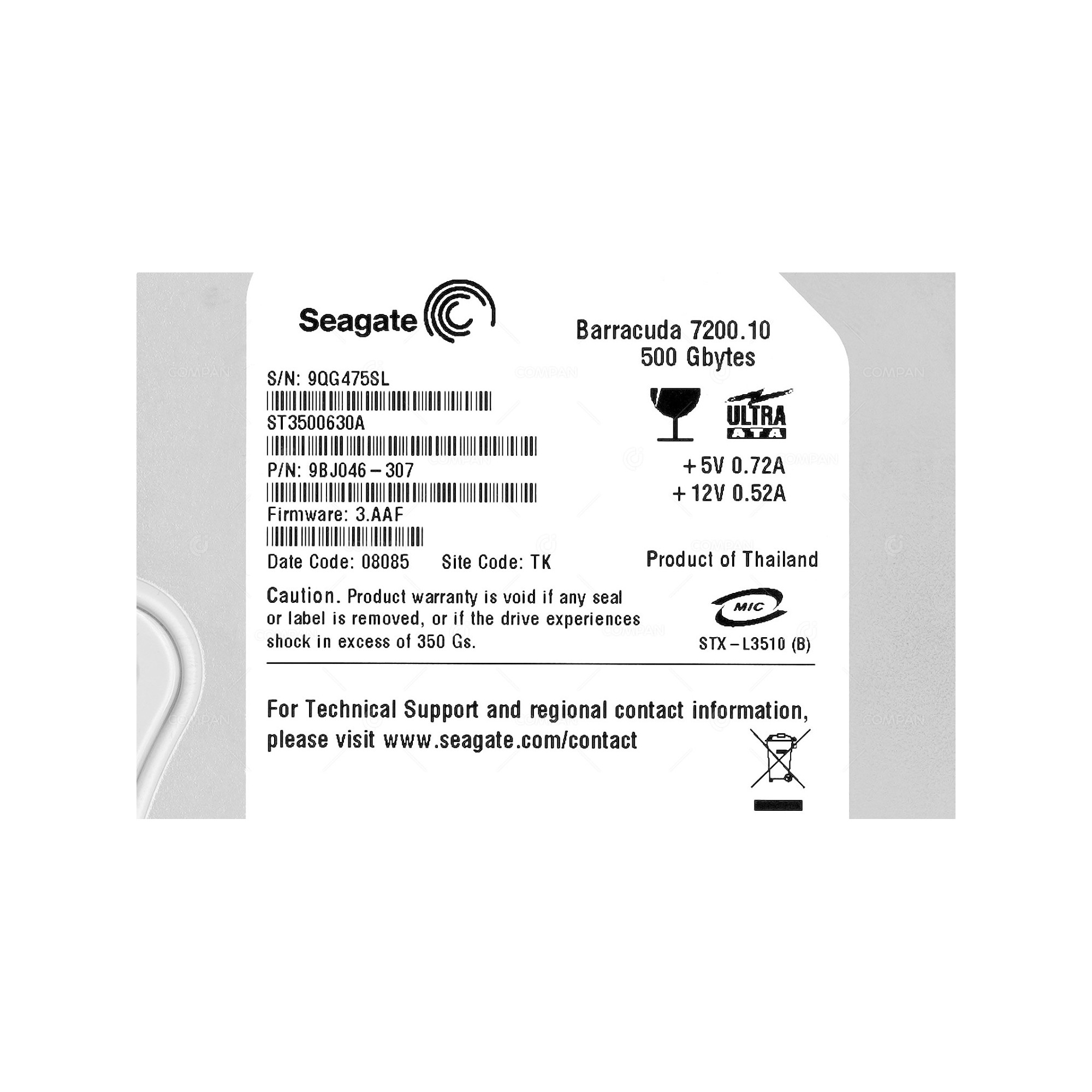 ST3500630A SEAGATE HARD DRIVE 500GB 7.2K 3.5 LFF ATA 9BJ046