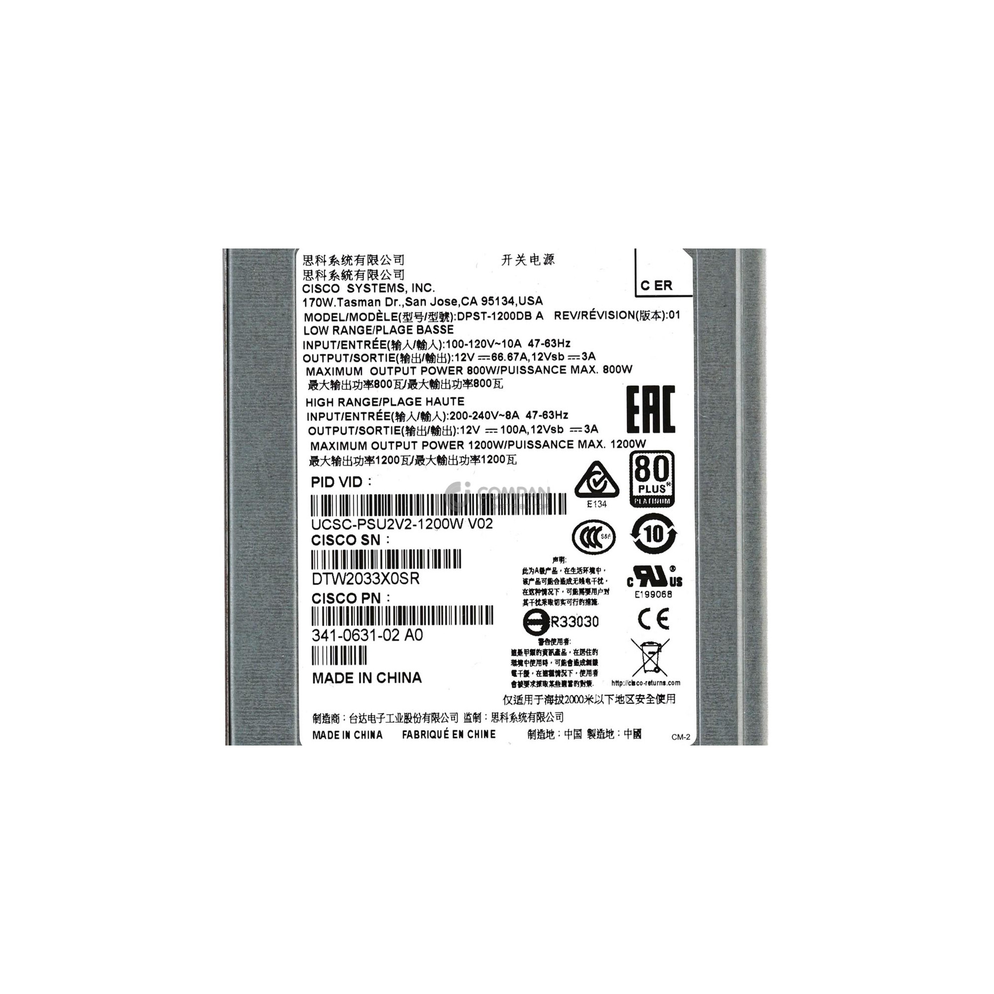 341-0631-02 CISCO 1200W 80PLUS PLATINUM POWER SUPPLY FOR CISCO UCS M4