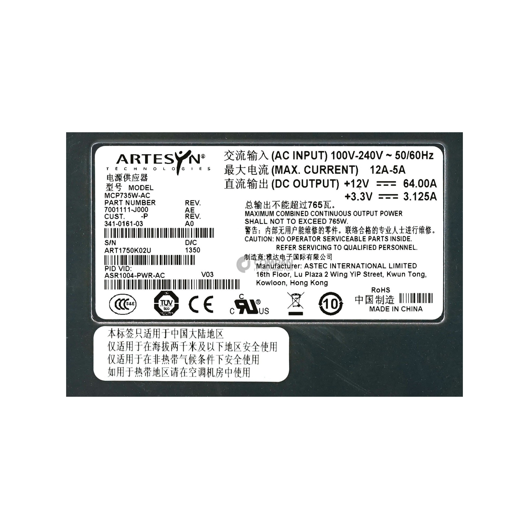 ASR1004-PWR-AC CISCO 765W POWER SUPPLY FOR ASR1004 341-0161-03