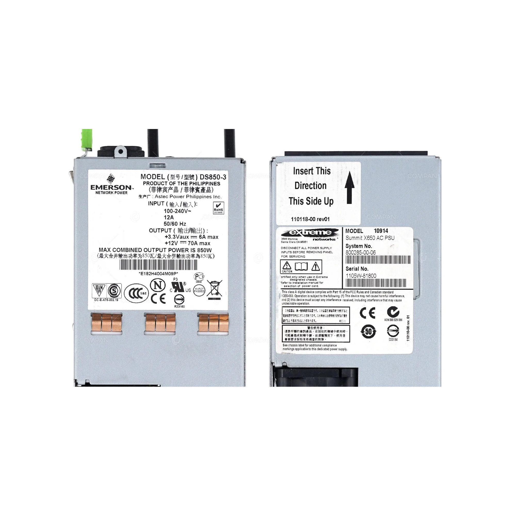 10914 EXTREME NETWORK SUMMIT 850W AC POWER SUPPLY FOR X650 800285-00-06, DS850-3