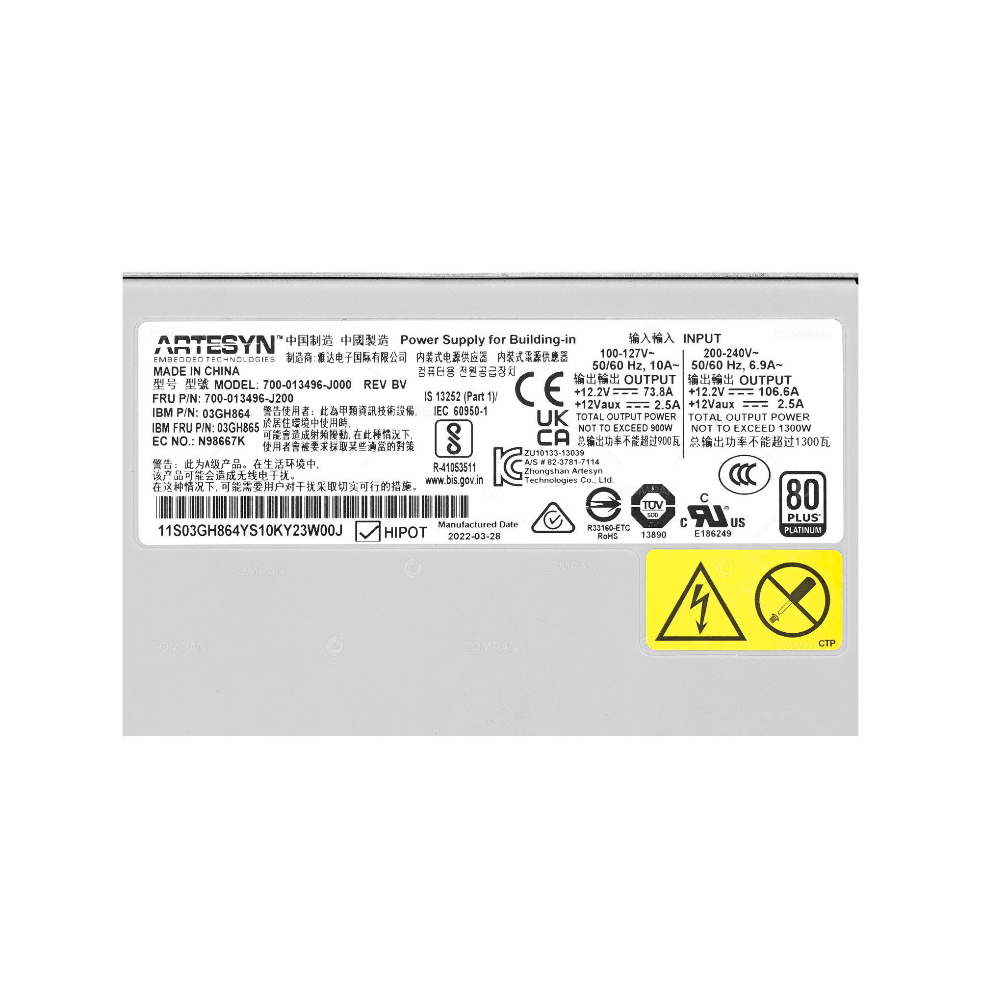 03GH865 IBM POWER SUPPLY 1300W AC FOR FLASH SYSTEM 840 900