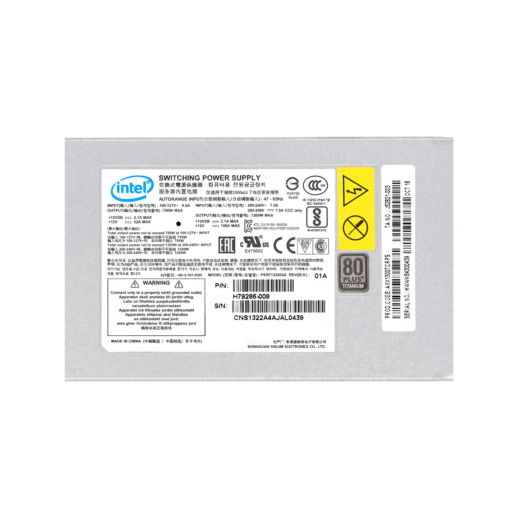 AXX1300TCRPS INTEL 1300W 80PLUS TITANIUM POWER SUPPLY FOR R2224WFTZS