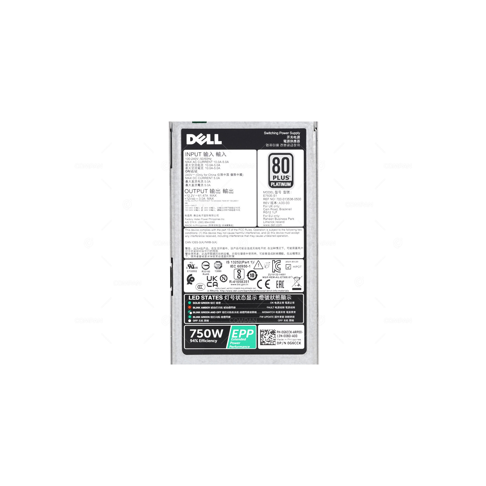 G6CCK DELL 750W 80 PLUS PLATINUM POWER SUPPLY FOR R630 R640 R730 R740 T430 T440 T630 T640