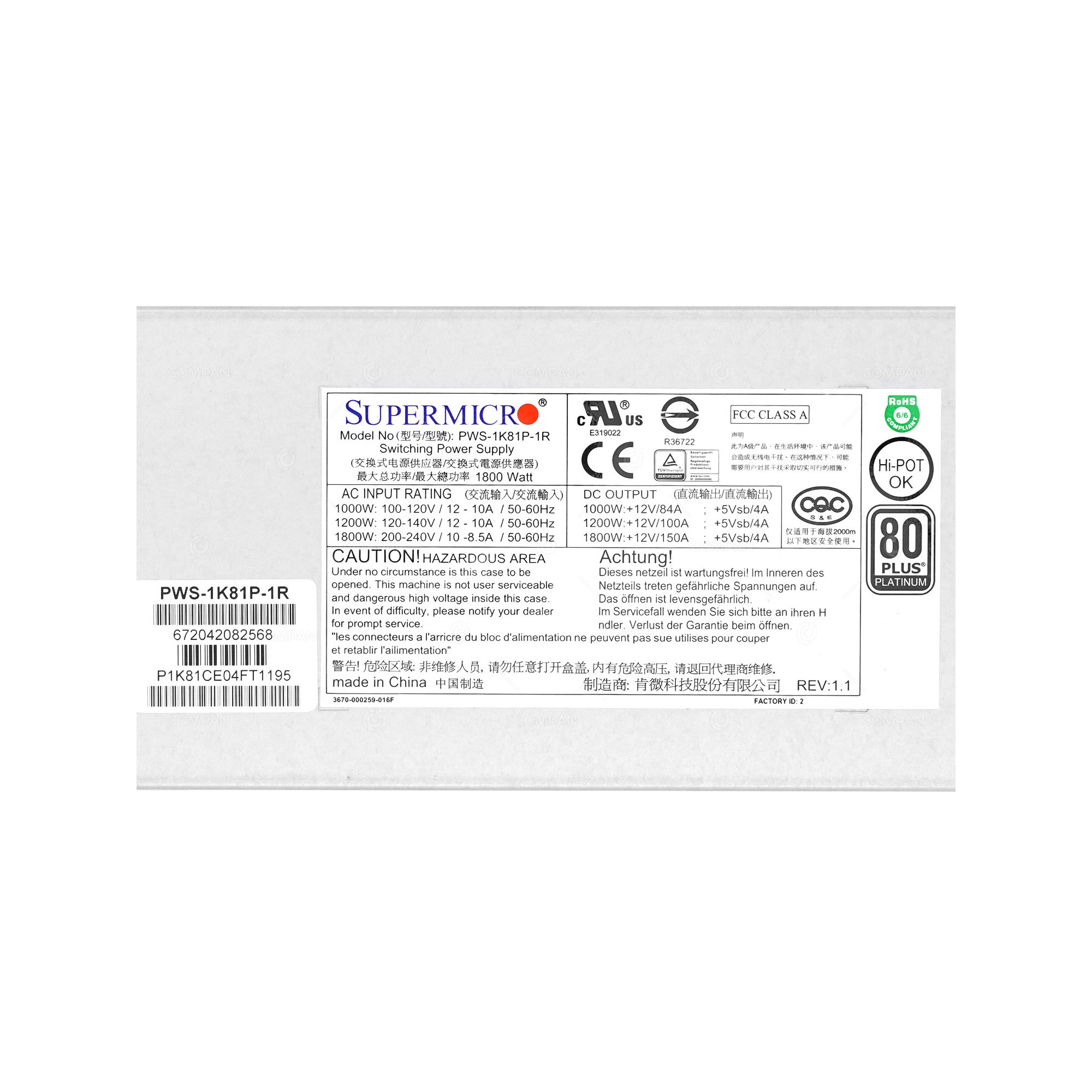 PWS-1K81P-1R SUPERMICRO PLATINUM 1800W POWER SUPPLY FOR NUTANIX NX-7110