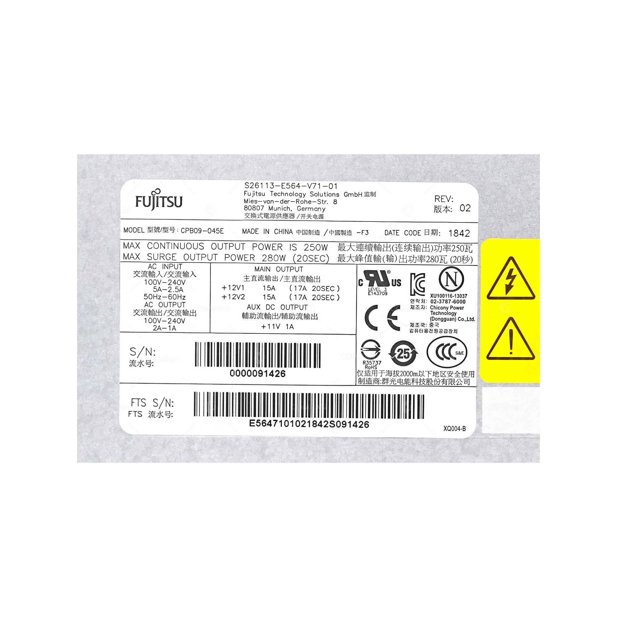 S26113-E564-V71-01 FUJITSU POWER SUPPLY 280W 240V FOR TX1320 M3