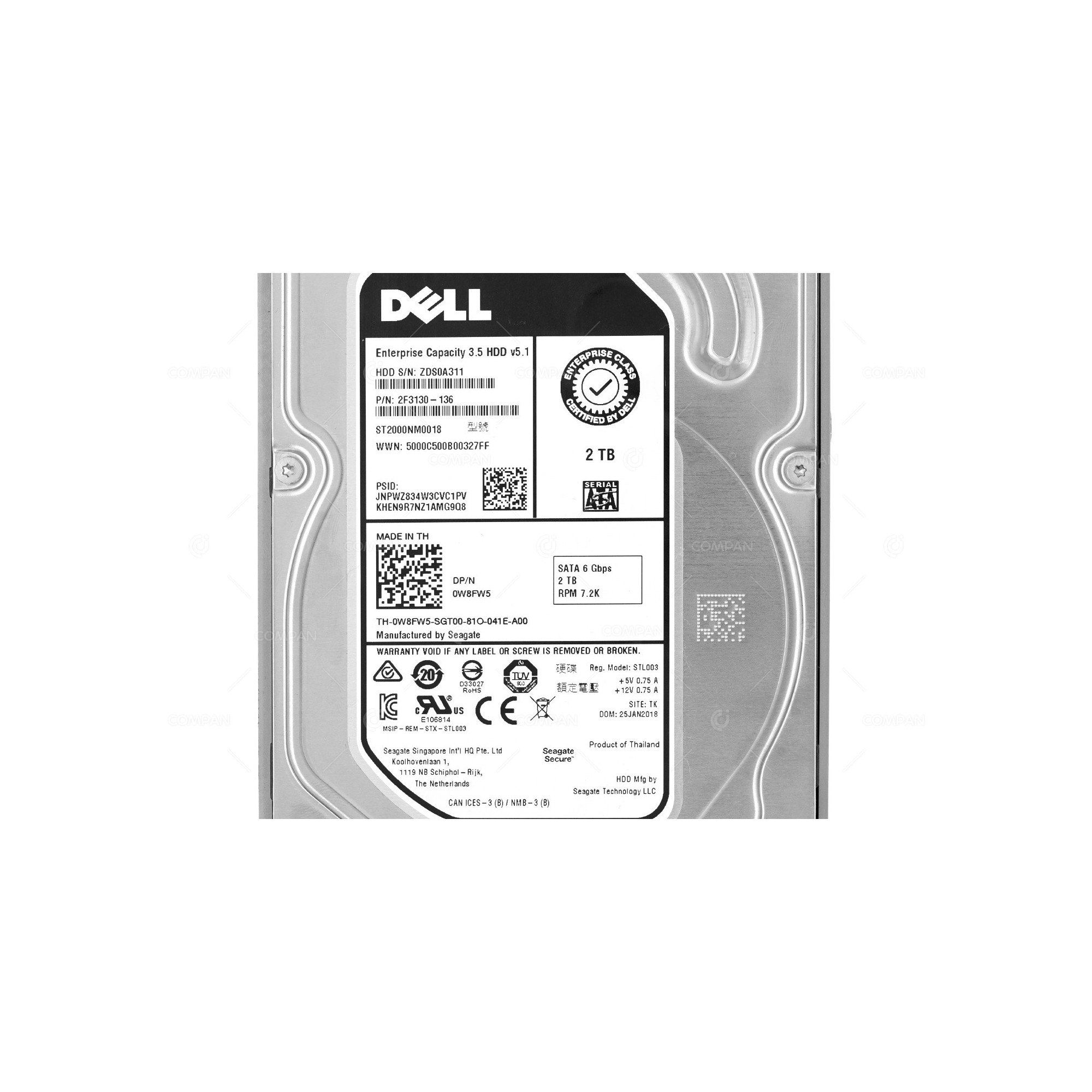 W8FW5 DELL 2TB 7.2K 6G SATA 3.5 LFF HARD DRIVE 0W8FW5, ST2000NM0018