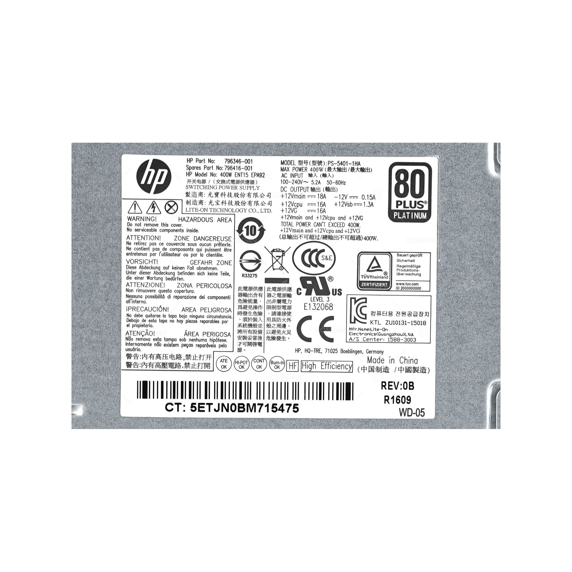 796416-001 HP 400W ENT15 EPA92 80 PLUS PLATINUM POWER SUPPLY FOR WS Z240 796346-001, PS-5401-1HA