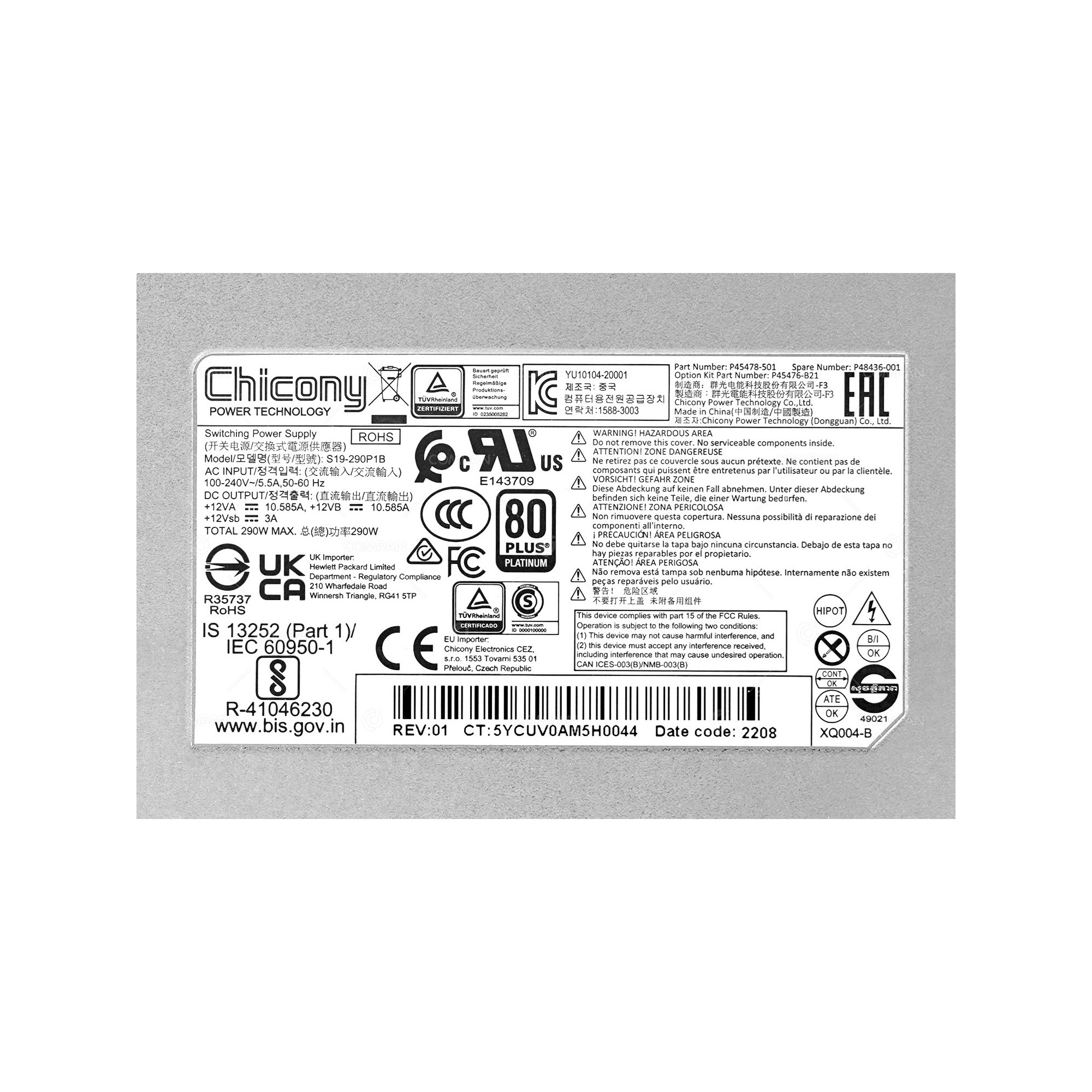 HP POWER SUPPLY 290W 80 PLUS PLATINUM 240V FOR DL20 G10