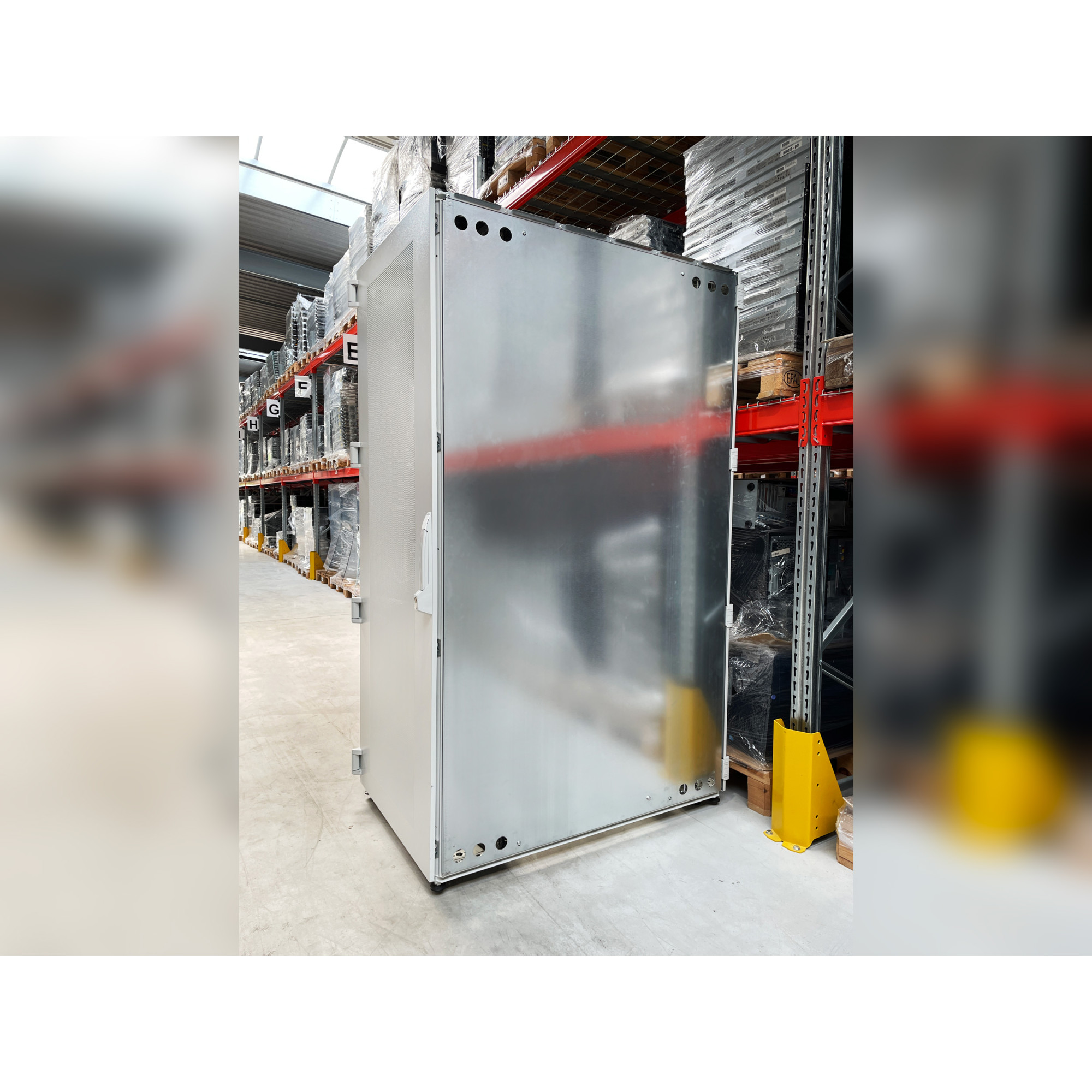 Rittal TS IT 42U Rack Cabinet with Splitter Rear Doors & Both Side Covers for Data centers. The platform meets all the expectations of a modern network or server rack. Maximum load capacity and structured cable management for universal use as a floor distributor or in a data center. Solid door for high-performance server applications with vented doors for room air-conditioning. This solid high-end rack cabinet is made by Rittal, German company well known for their high quality rack cabinets and data center aimed products.