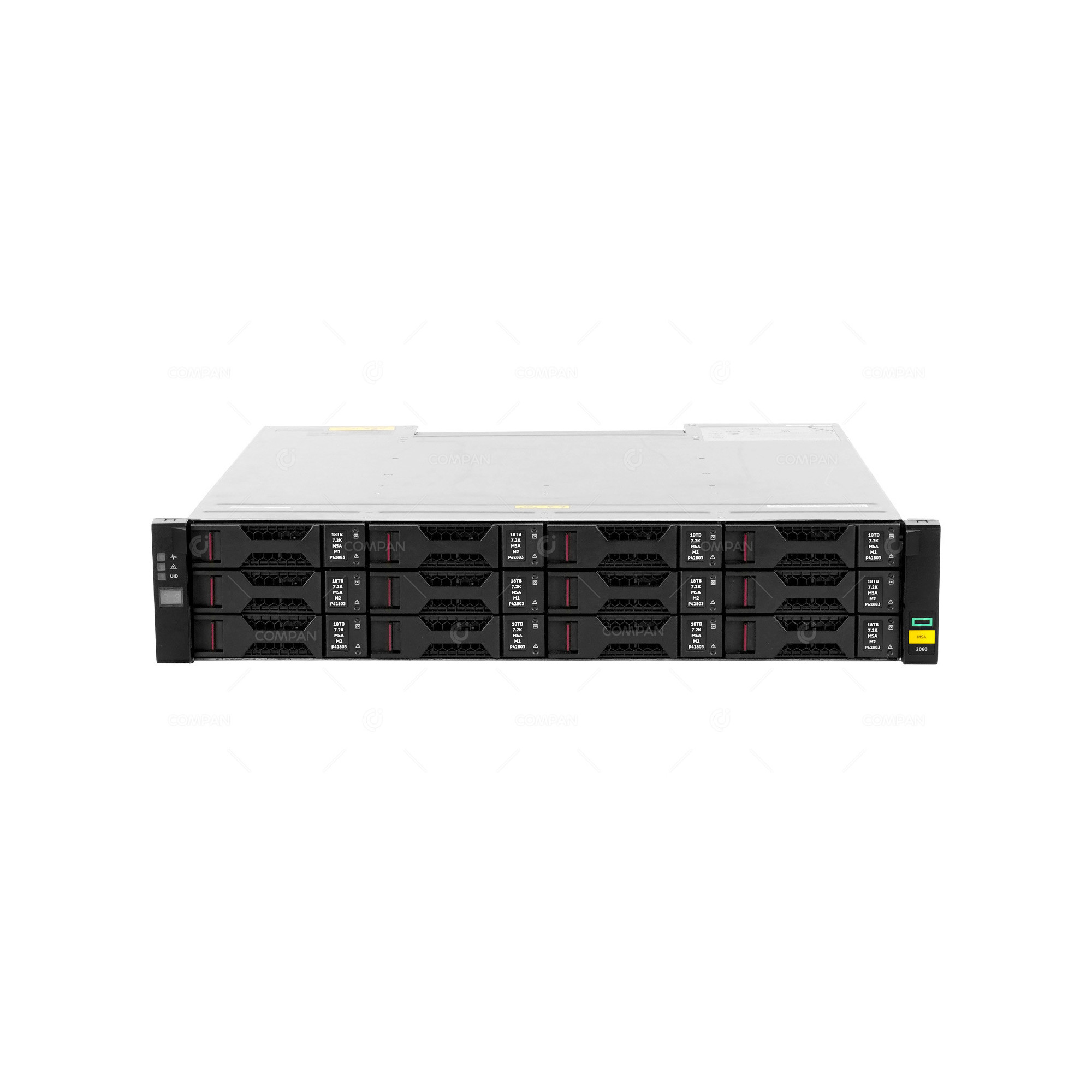 This model features dual-active controllers, each equipped with four 16Gb Fibre Channel host ports, providing a total of eight FC ports for high-availability connectivity to Fibre Channel SAN environments. The base chassis supports up to 12 large form factor (LFF) 3.5-inch drives, allowing up to 216 TB of raw capacity when populated with 18 TB drives, and can scale up to 2.16 PB with the addition of expansion enclosures.