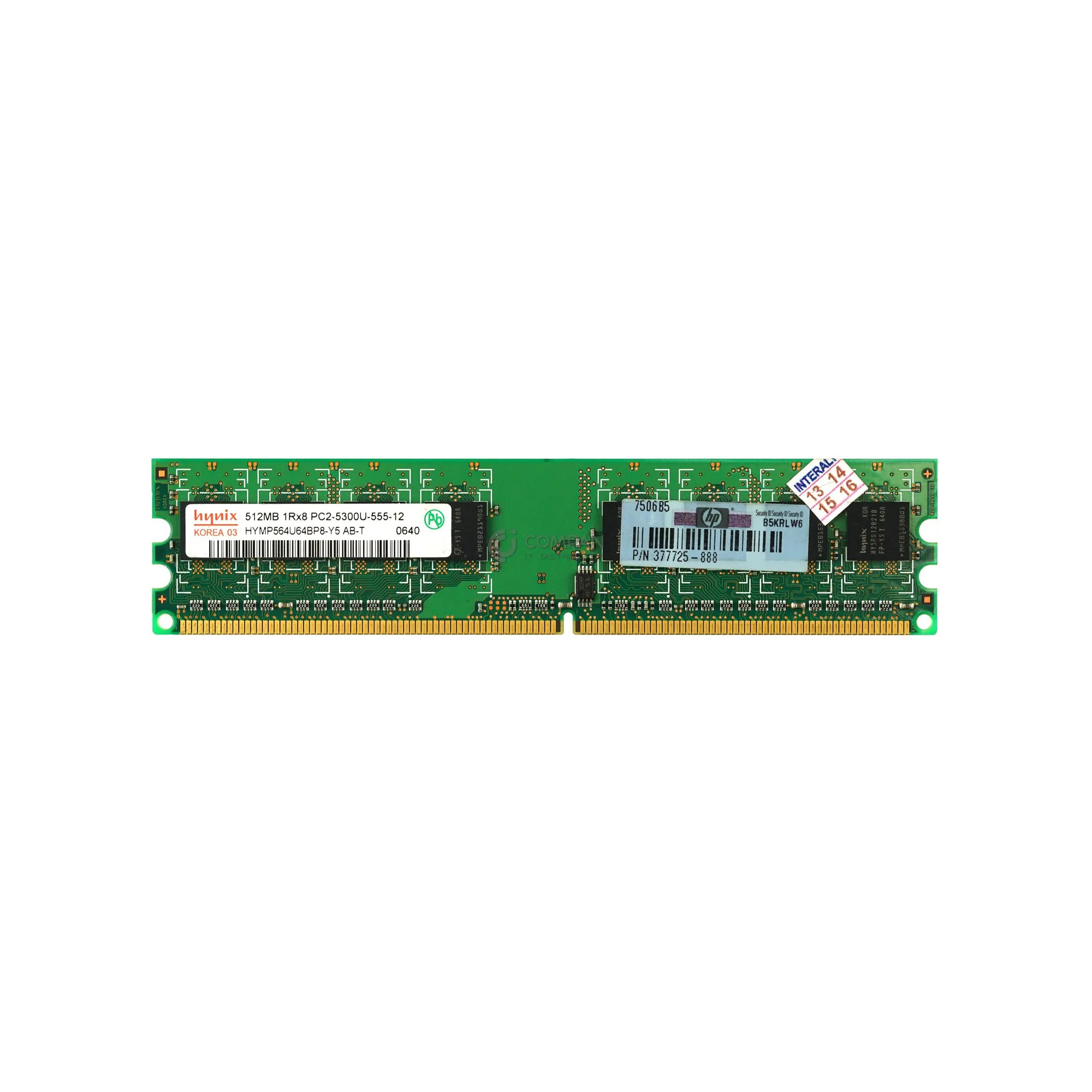 377725-888 HP MEMORY 512MB 1RX8 PC2 5300U DDR2 Capacity: 512 MB Product Number: 377725-888 Bus Speed: PC2-5300 (DDR2-667) Memory Features: non-ECC Form Factor: DIMM