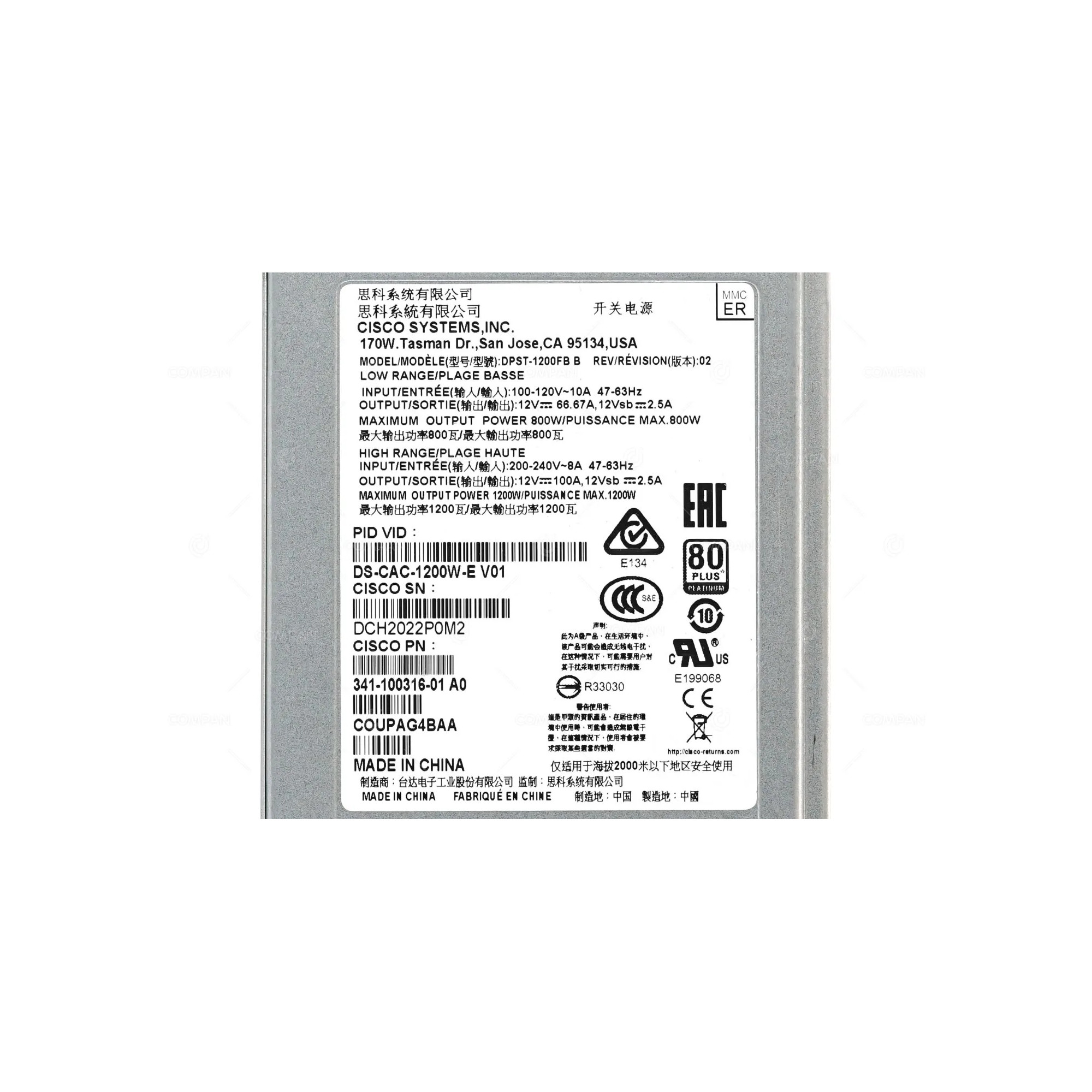 DS-CAC-1200W-E CISCO 1200W 80 PLUS PLATINUM POWER SUPPLY FOR DS-C9396S-K9 341-100316-01, DPST-1200FB
