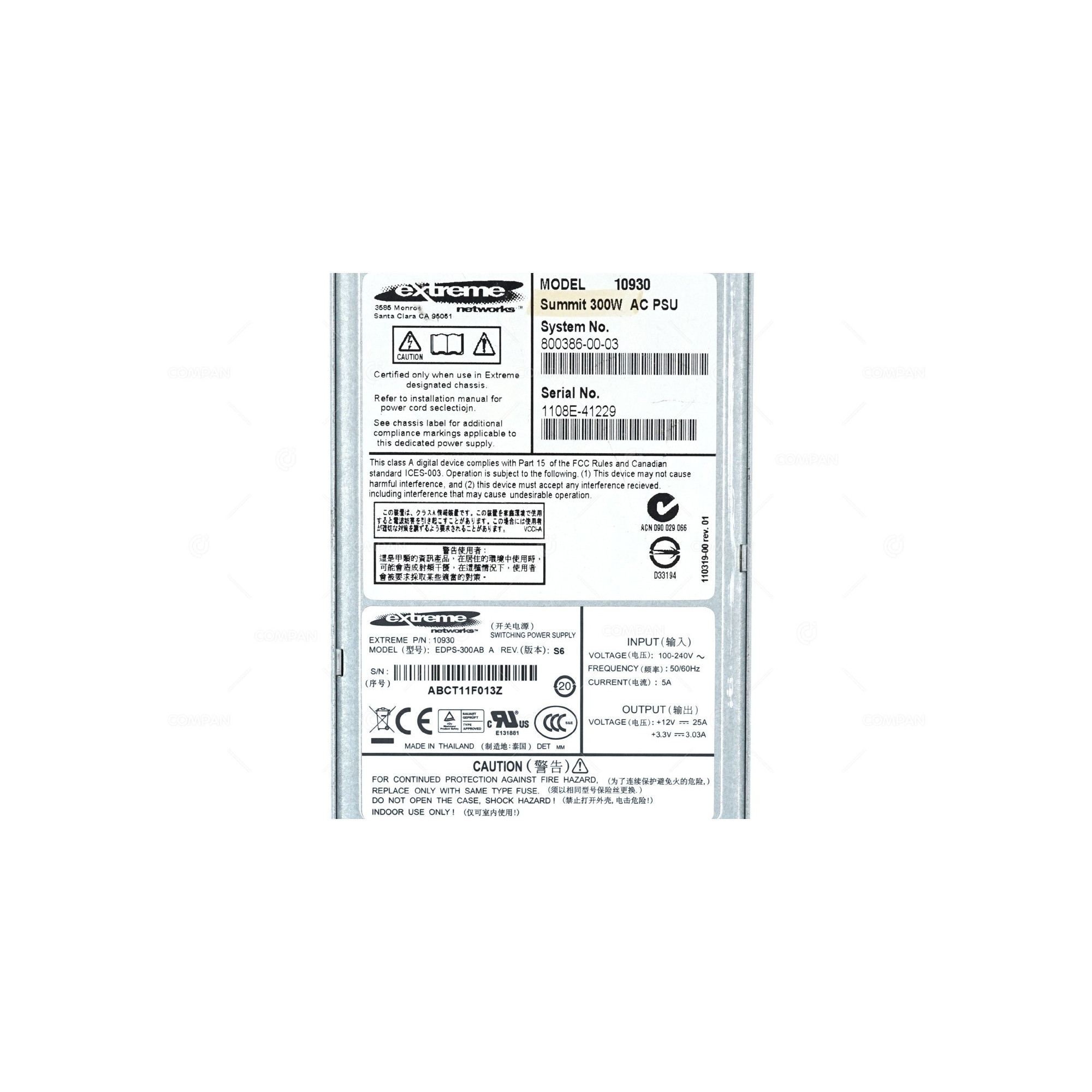 10930 EXTREME NETWORK SUMMIT 300W AC POWER SUPPLY FOR X460 800386-00-03, EDPS-300AB 10930 EXTREME NETWORK SUMMIT 300W AC POWER SUPPLY FOR X460 800386-00-03, EDPS-300AB 10930 EXTREME NETWORK SUMMIT 300W AC POWER SUPPLY FOR X460 800386-00-03, EDPS-300AB 10930 EXTREME NETWORK SUMMIT 300W AC POWER SUPPLY FOR X460 800386-00-03, EDPS-300AB