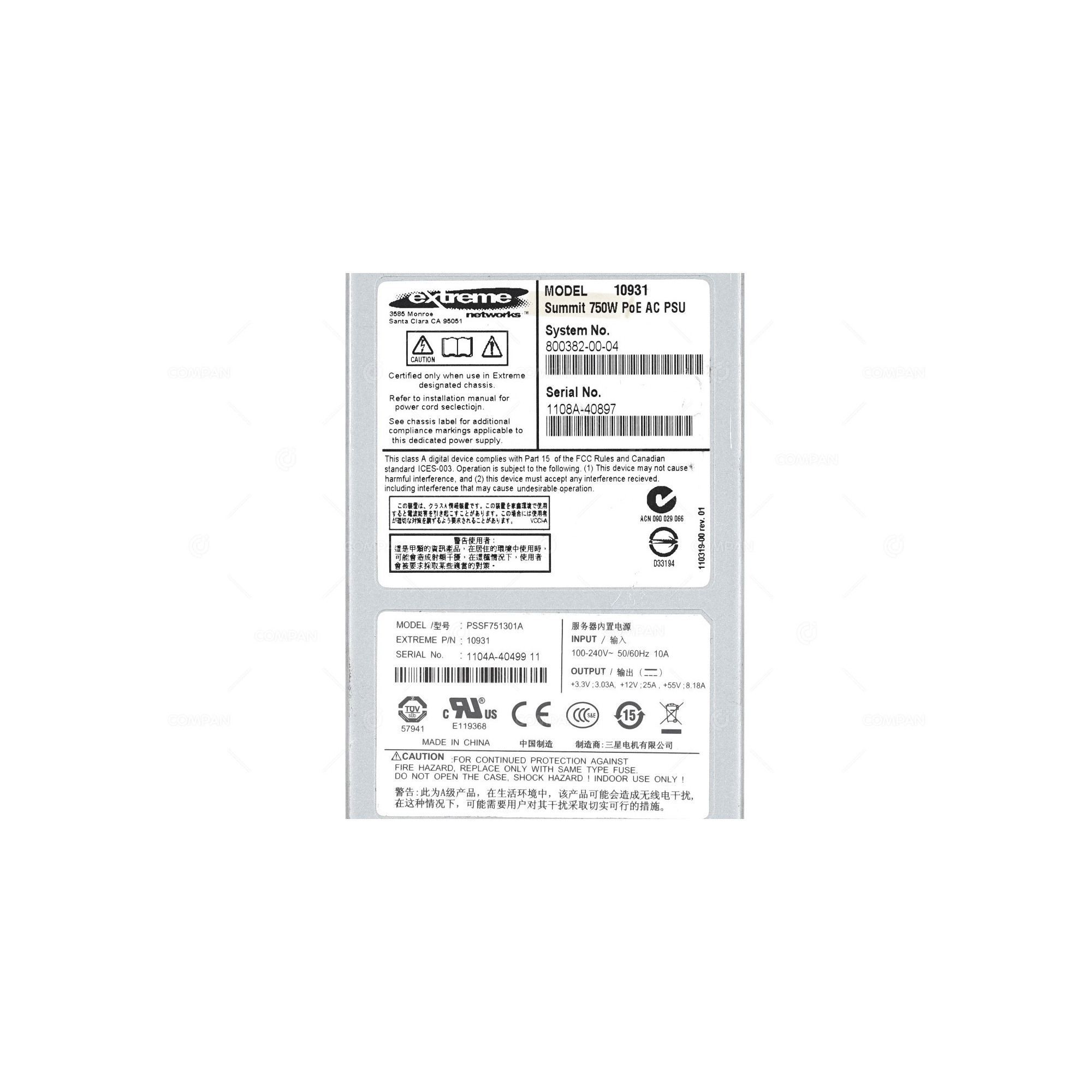 10931 EXTREME NETWORK SUMMIT 750W AC POWER SUPPLY FOR X460 800382-00-03, PSSF751301A 10931 EXTREME NETWORK SUMMIT 750W AC POWER SUPPLY FOR X460 800382-00-03, PSSF751301A 10931 EXTREME NETWORK SUMMIT 750W AC POWER SUPPLY FOR X460 800382-00-03, PSSF751301A 10931 EXTREME NETWORK SUMMIT 750W AC POWER SUPPLY FOR X460 800382-00-03, PSSF751301A
