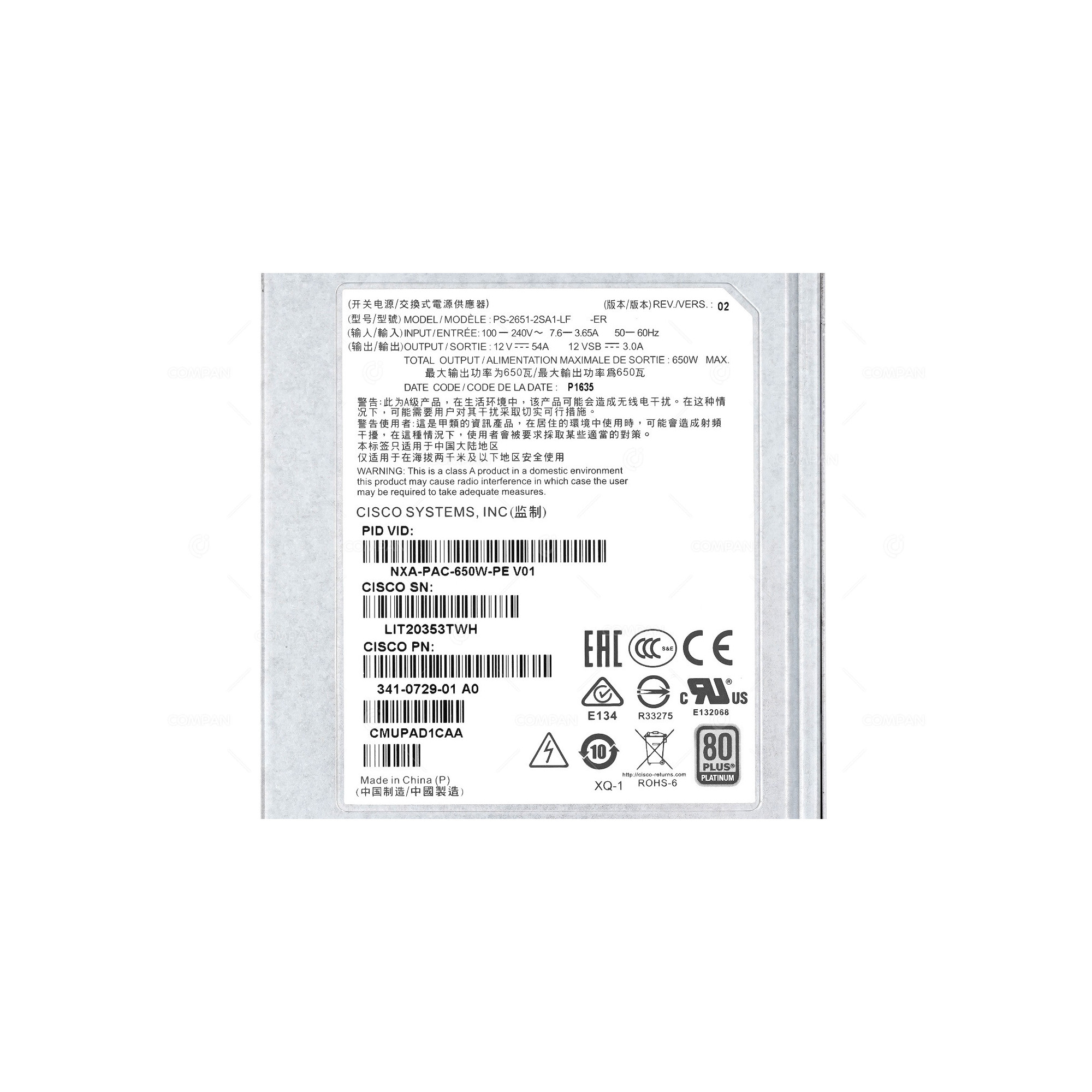 341-0729-01 CISCO POWER SUPPLY 650W FOR N9K NXA-PAC-650W-PE, CMUPAD1CAA 341-0729-01 CISCO POWER SUPPLY 650W FOR N9K NXA-PAC-650W-PE, CMUPAD1CAA 341-0729-01 CISCO POWER SUPPLY 650W FOR N9K NXA-PAC-650W-PE, CMUPAD1CAA 341-0729-01 CISCO POWER SUPPLY 650W FOR N9K NXA-PAC-650W-PE, CMUPAD1CAA