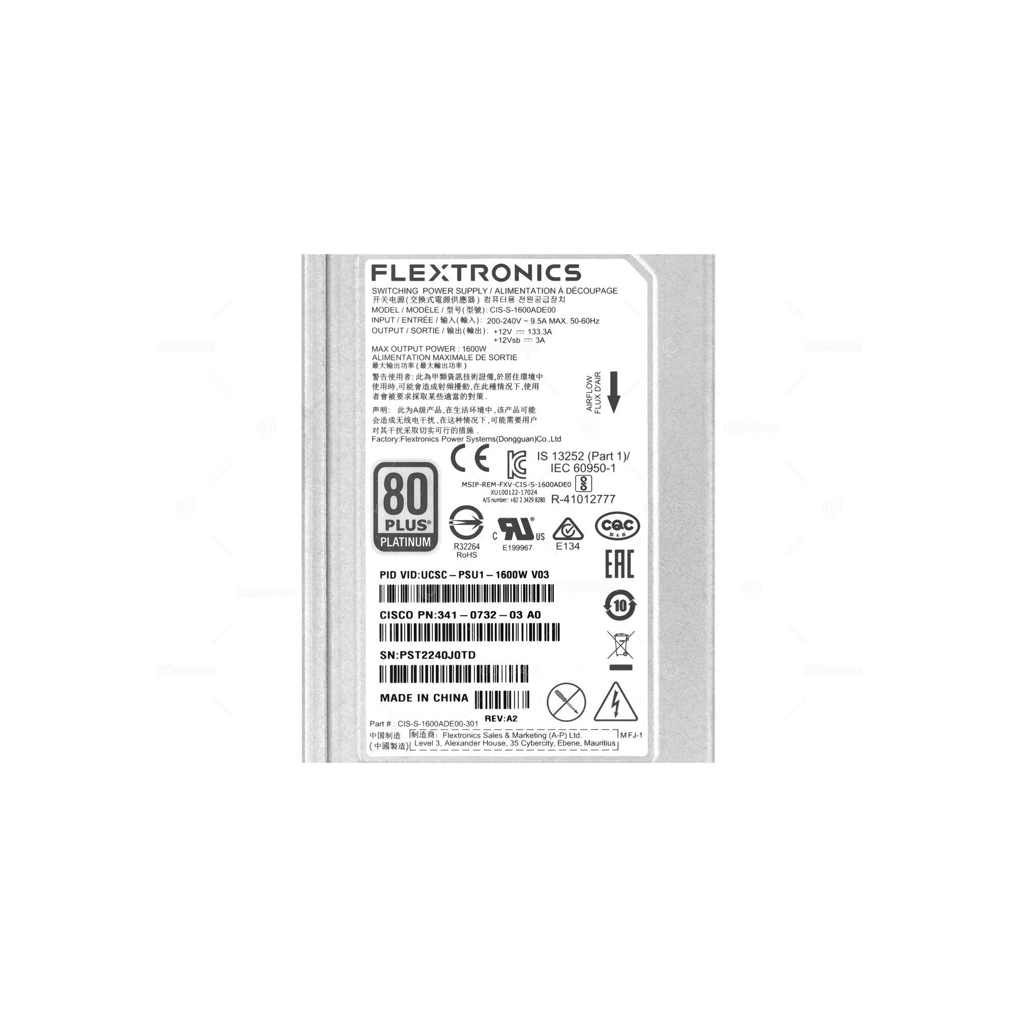 341-0732-03 CISCO POWER SUPPLY 1600W AC 80 PLUS PLATINUM FOR HX240C UCS C240 M4 UCSC-PSU1-1600W