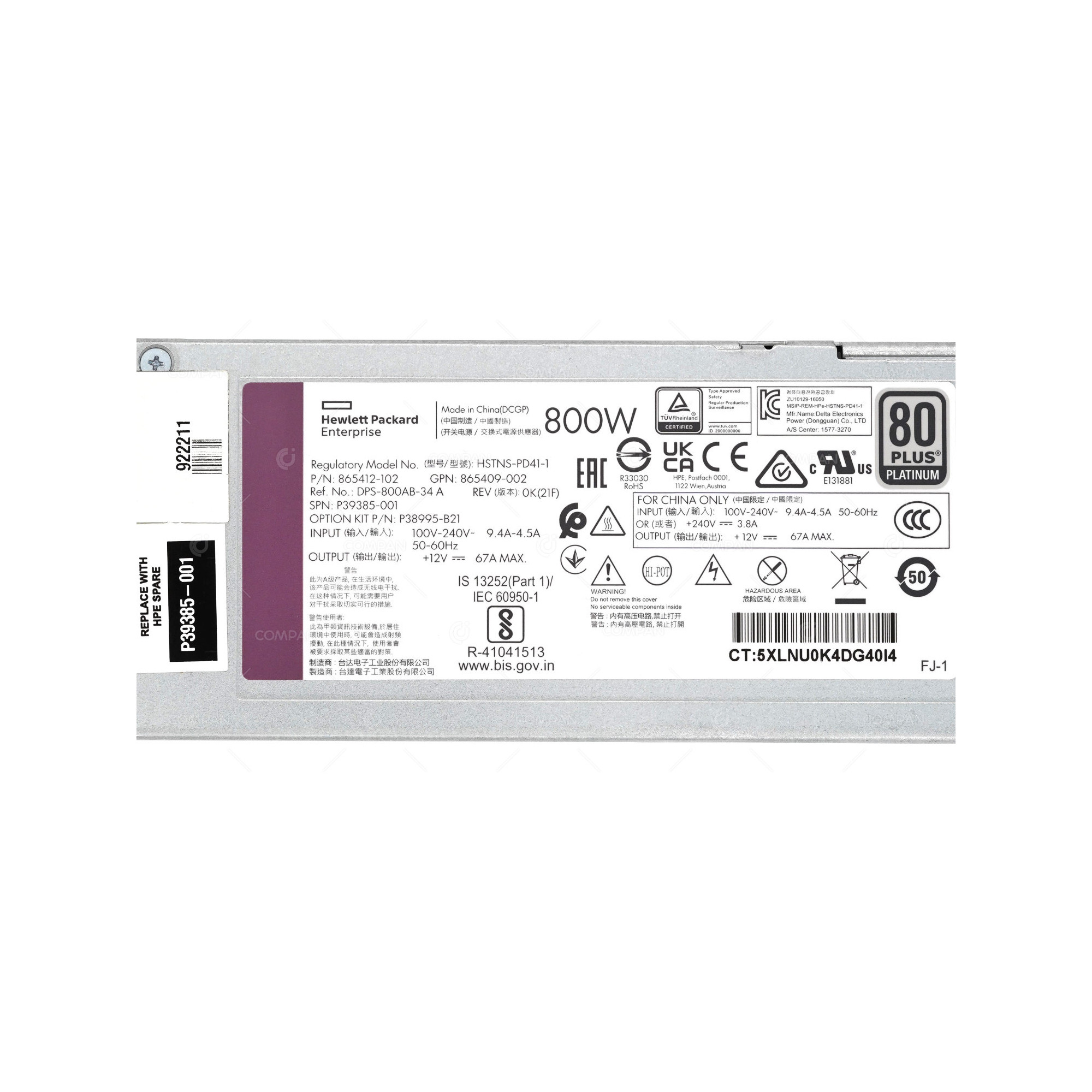 865412-102, 865409-002, P38995-B21, DPS-800AB-34, HSTNS-PD41-1 ,865412-202
